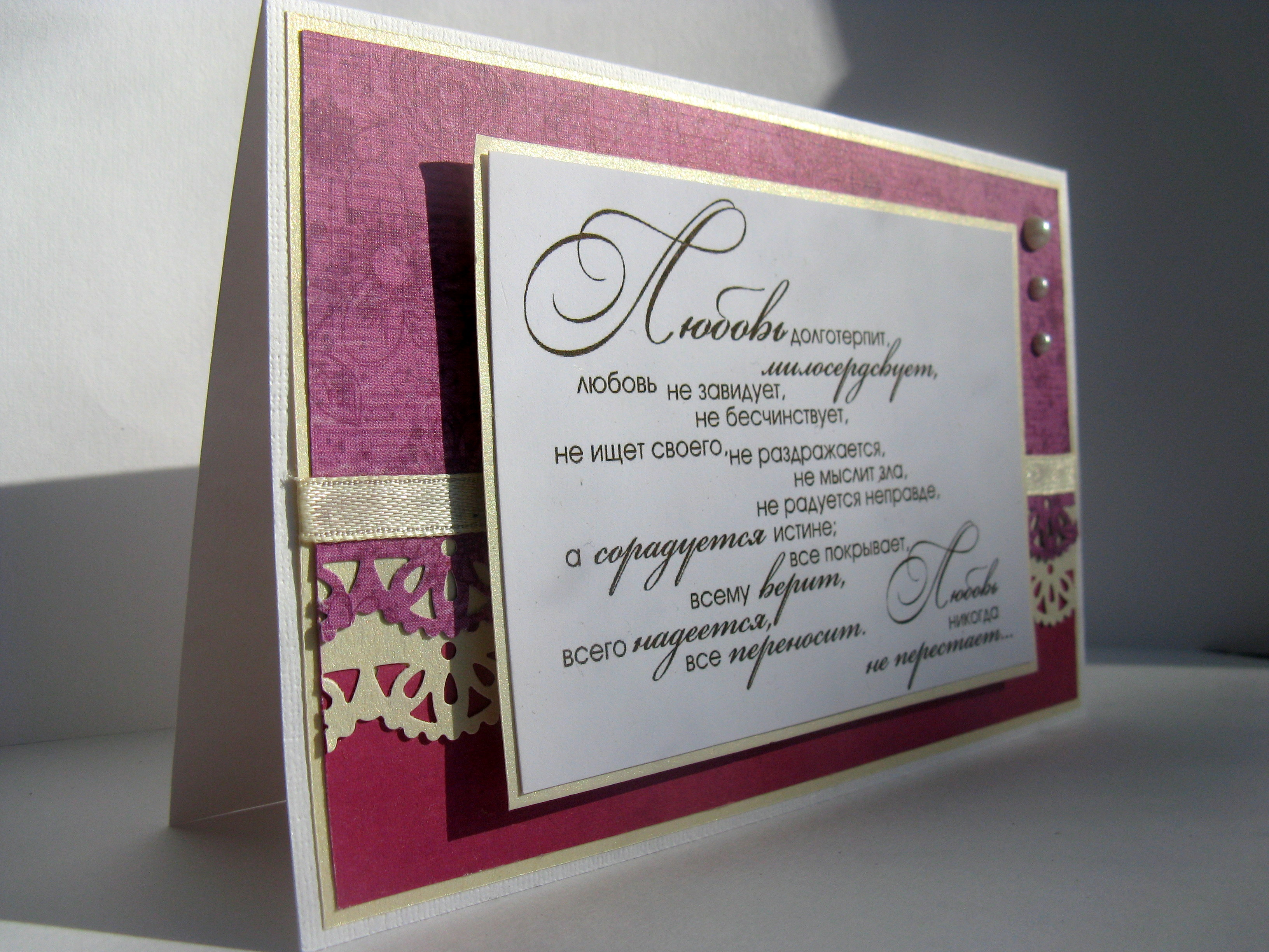 Бордовая бумага приятная на ощупь, "теплая", как будто бархатистая. Золотистая бумага слегка блестит на свету. Надпись приподнята над основной плоскостью открытки на объемном скотче.